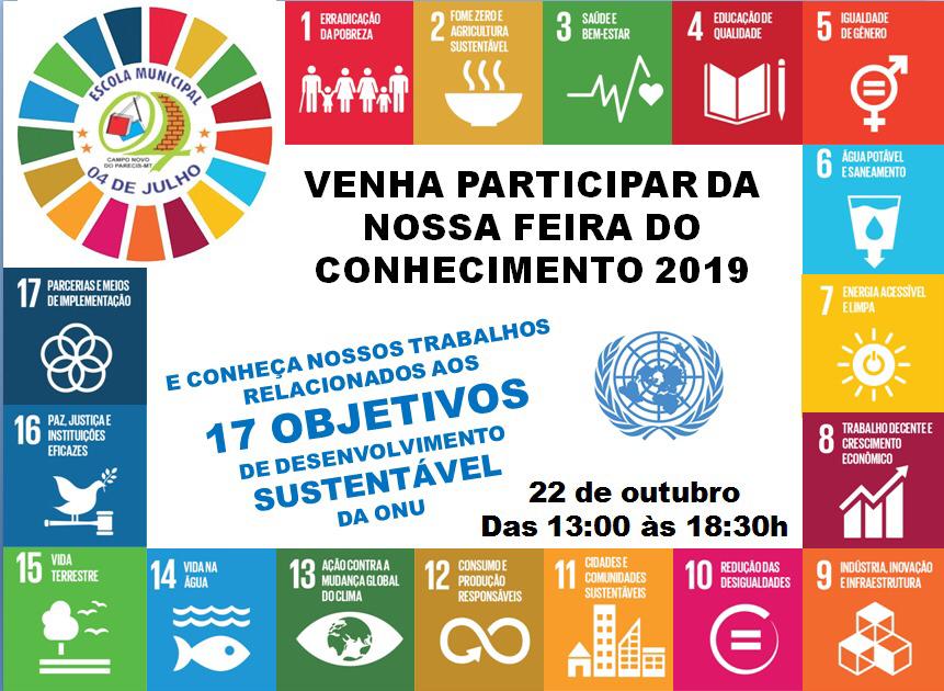 O evento acontecerá dia 22 de outubro na escola Municipal 04 de julho das 13h as 18:30h, tendo como base 17 objetivos do Desenvolvimento Sustentável da ONU (Organização das Nações Unidas).