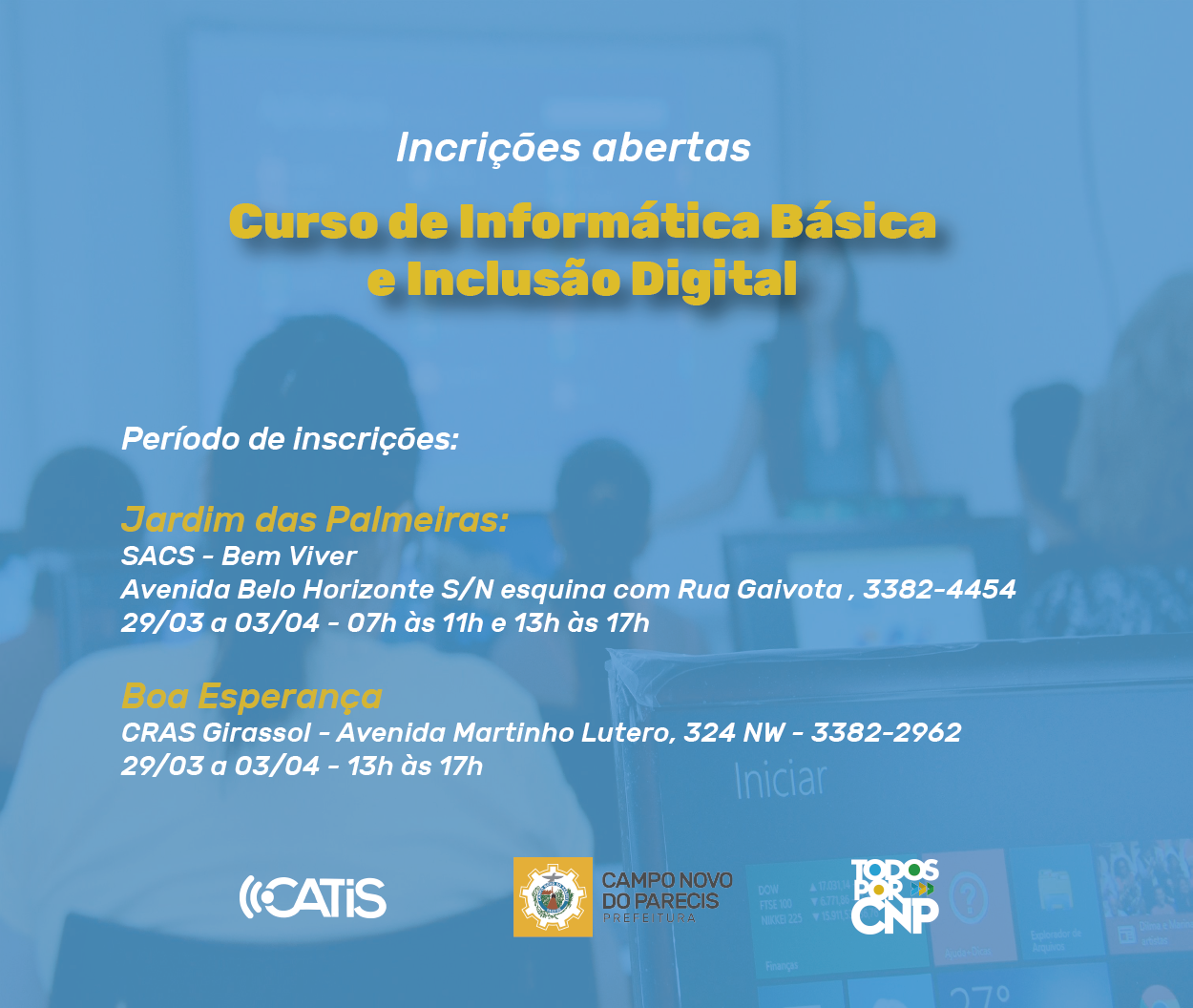 Estão abertas as matrículas para Curso de Informática Básica e Inclusão Digital que acontecerá no SACS - Bem Viver no Bairro Jardim das Palmeiras e na Associação de Moradores do Bairro Boa Esperança, com início previsto para o dia 08 de abril.