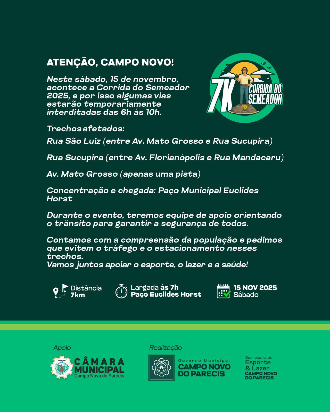 Neste sábado, 15 de novembro, acontece a Corrida do Semeador 2025, e algumas vias estarão temporariamente interditadas das 6h às 10h para garantir a segurança dos participantes.