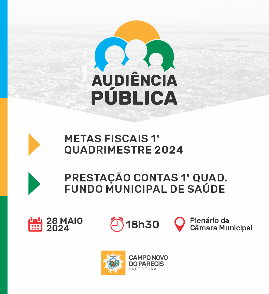 A Prefeitura Municipal de Campo Novo do Parecis realizará nesta terça-feira, 28, uma Audiência Pública para apresentar o cumprimento das metas fiscais do primeiro quadrimestre de 2024 e prestar contas das ações do Fundo Municipal de Saúde no mesmo período. A sessão acontecerá no Plenário da Câmara Municipal as 18h30.