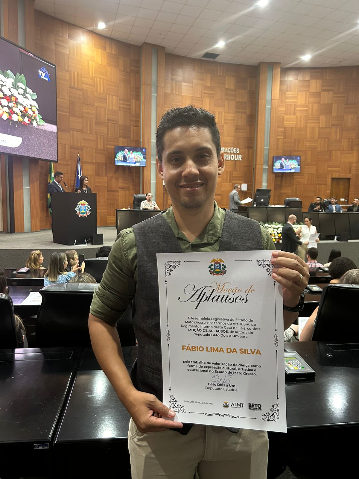 Durante a sessão, foram homenageados diversos profissionais da dança que se destacaram por sua contribuição à arte. Dentre os homenageados, o bailarino, coreógrafos e professor, Fábio Lima da Silva de Campo Novo do Parecis, que recebeu uma placa de reconhecimento.