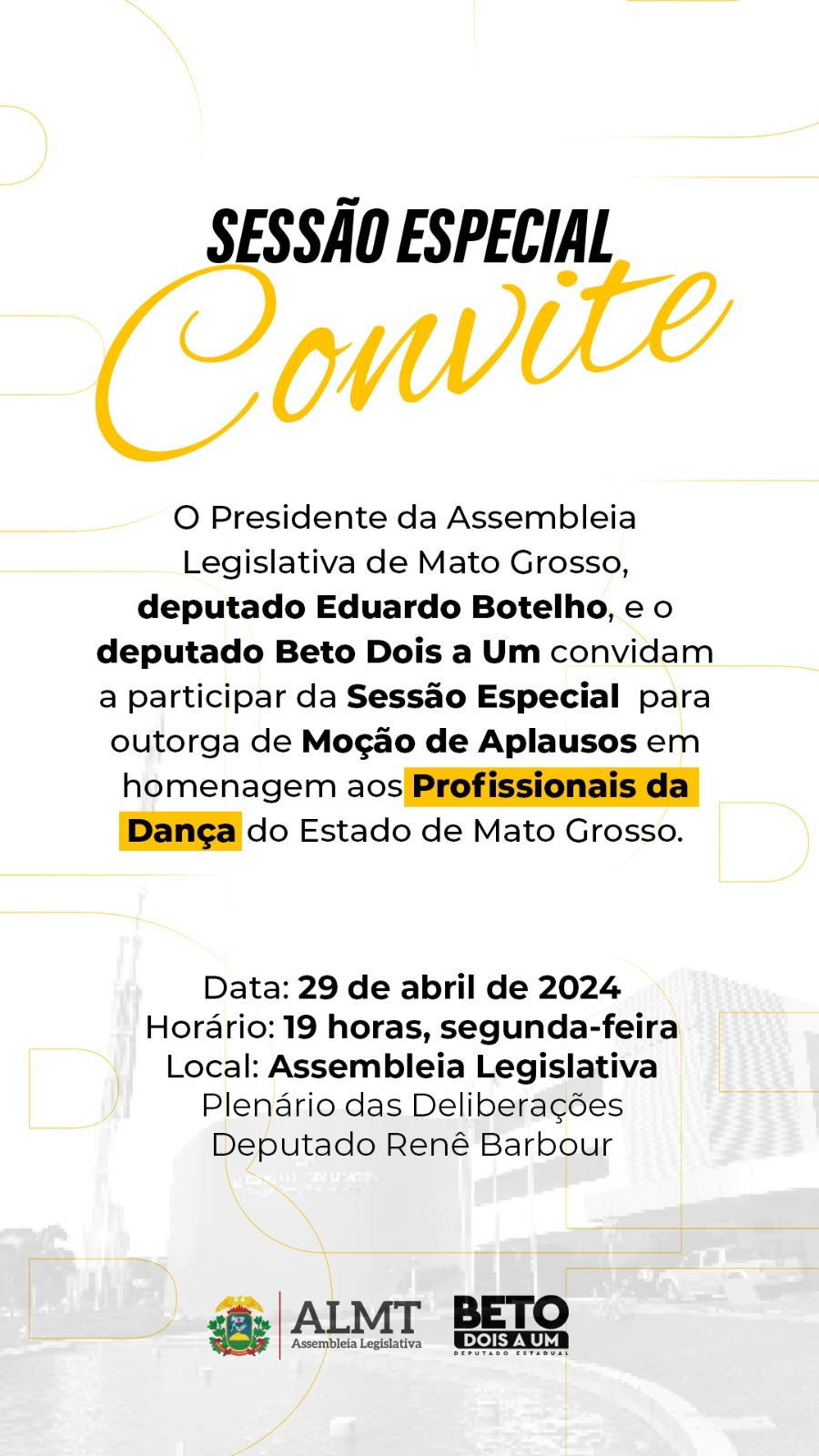 A Assembleia Legislativa de Mato Grosso realizou nesta segunda-feira (29) uma Sessão Especial para homenagear os profissionais da dança do estado. A iniciativa, idealizada pelo deputado Eduardo Botelho e pelo deputado Beto Dois a Um, reuniu autoridades, bailarinos, coreógrafos e entidades ligadas à área em um evento que celebrou a arte e a cultura mato-grossenses.