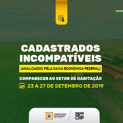 A Assistência Social de Campo Novo do Parecis divulgou nova lista de cadastros incompatíveis anaisados pela caixa econômica federal que necessitam comparecer ao setor de habitação, referente as 400 casas do Residencial Parecis.
