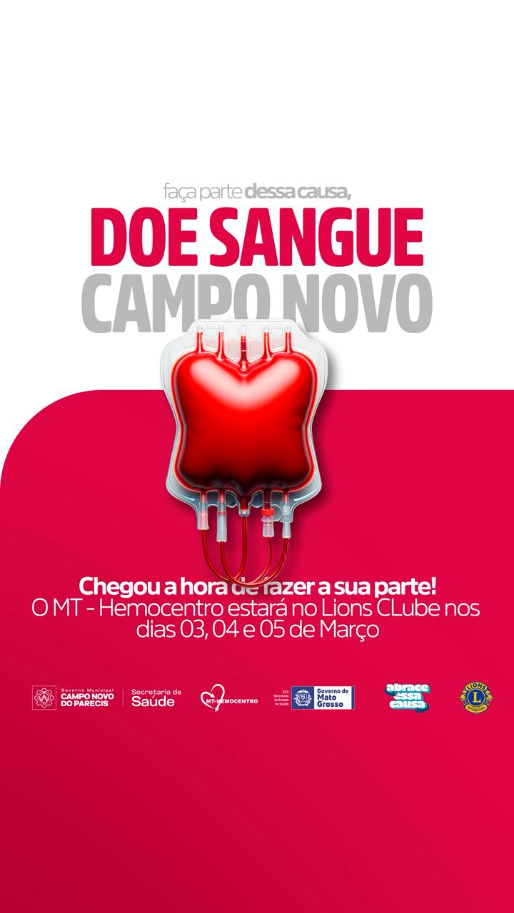 A Prefeitura de Campo Novo do Parecis, por meio da Secretaria Municipal de Saúde, em parceria com o MT Hemocentro e o Lions Clube, promove mais uma importante campanha de doação de sangue no município.