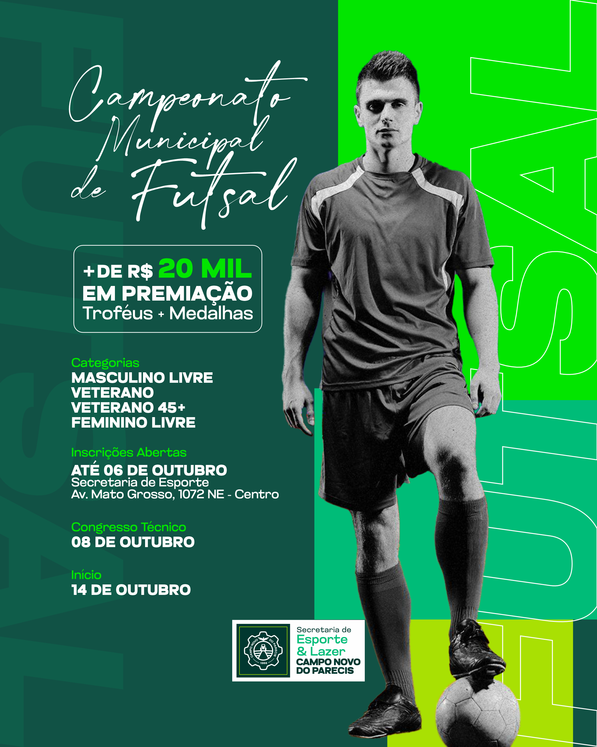 A Prefeitura de Campo Novo do Parecis, por meio da Secretaria Municipal de Esporte e Lazer, anuncia a abertura das inscrições para o Campeonato Municipal de Futsal 2025, uma das competições mais aguardadas do calendário esportivo local. O torneio contará com mais de R$ 21 mil em premiações, além de troféus e medalhas, e promete reunir atletas de diferentes idades e categorias em uma grande celebração do esporte.