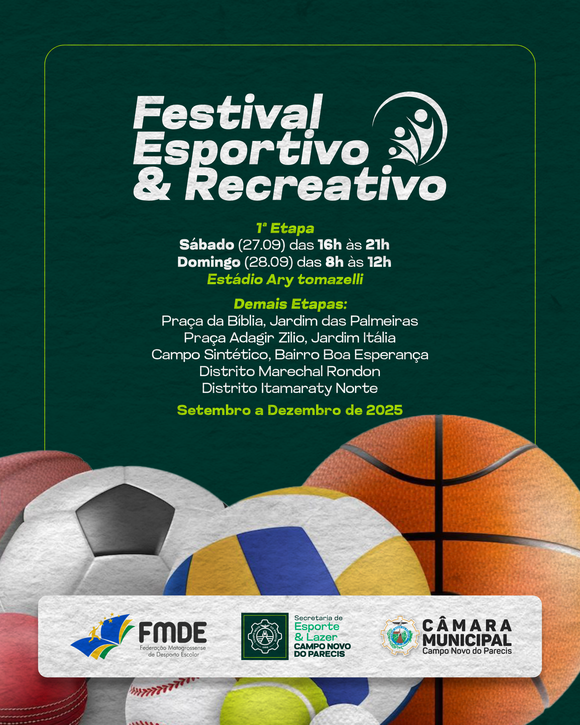 A Prefeitura de Campo Novo do Parecis, por meio da Secretaria Municipal de Esporte e Lazer, lança o Festival Esportivo & Recreativo, um grande circuito de atividades que vai percorrer bairros e distritos do município entre setembro e dezembro de 2025.