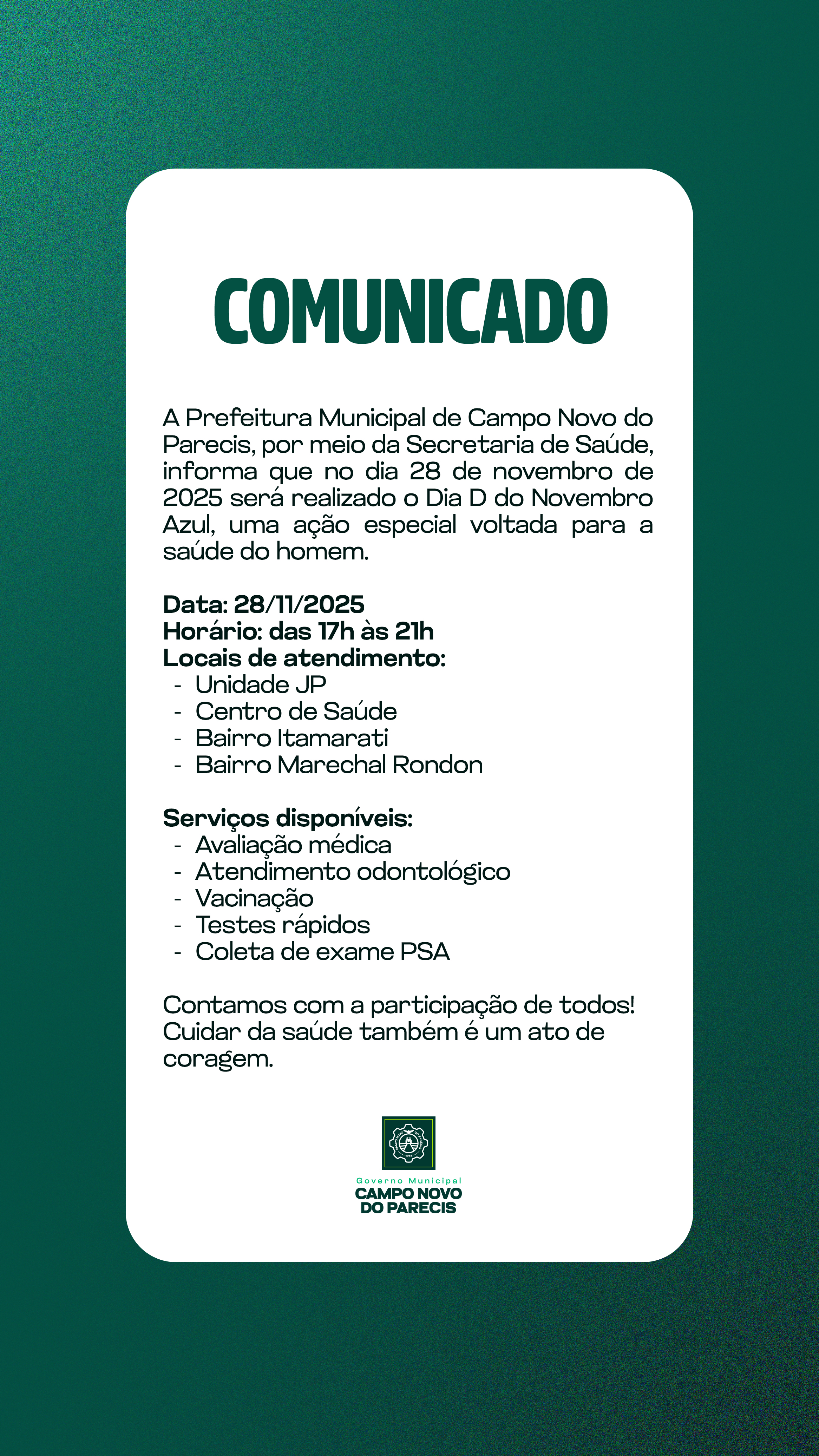 A Prefeitura Municipal de Campo Novo do Parecis, por meio da Secretaria de Saúde, realizará no dia 28 de novembro de 2025 o Dia D do Novembro Azul, iniciativa voltada à promoção da saúde do homem e à conscientização sobre a importância da prevenção e do diagnóstico precoce de doenças, especialmente o câncer de próstata.