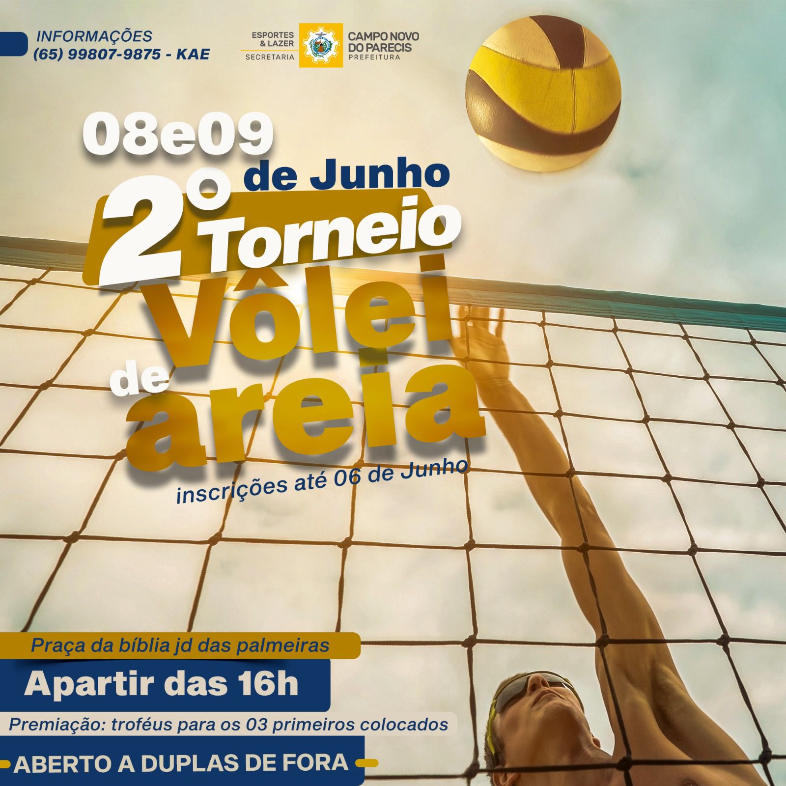 Neste final de semana, a cidade de Campo Novo do Parecis, em Mato Grosso, realizará o 2º Torneio de Vôlei de Areia na Praça da Bíblia, no bairro Jardim das Palmeiras. As inscrições vão até as 15h desta quinta-feira, 06 de junho e podem ser realizadas na Secretaria de Esportes ou no telefone (65)99807-9875.