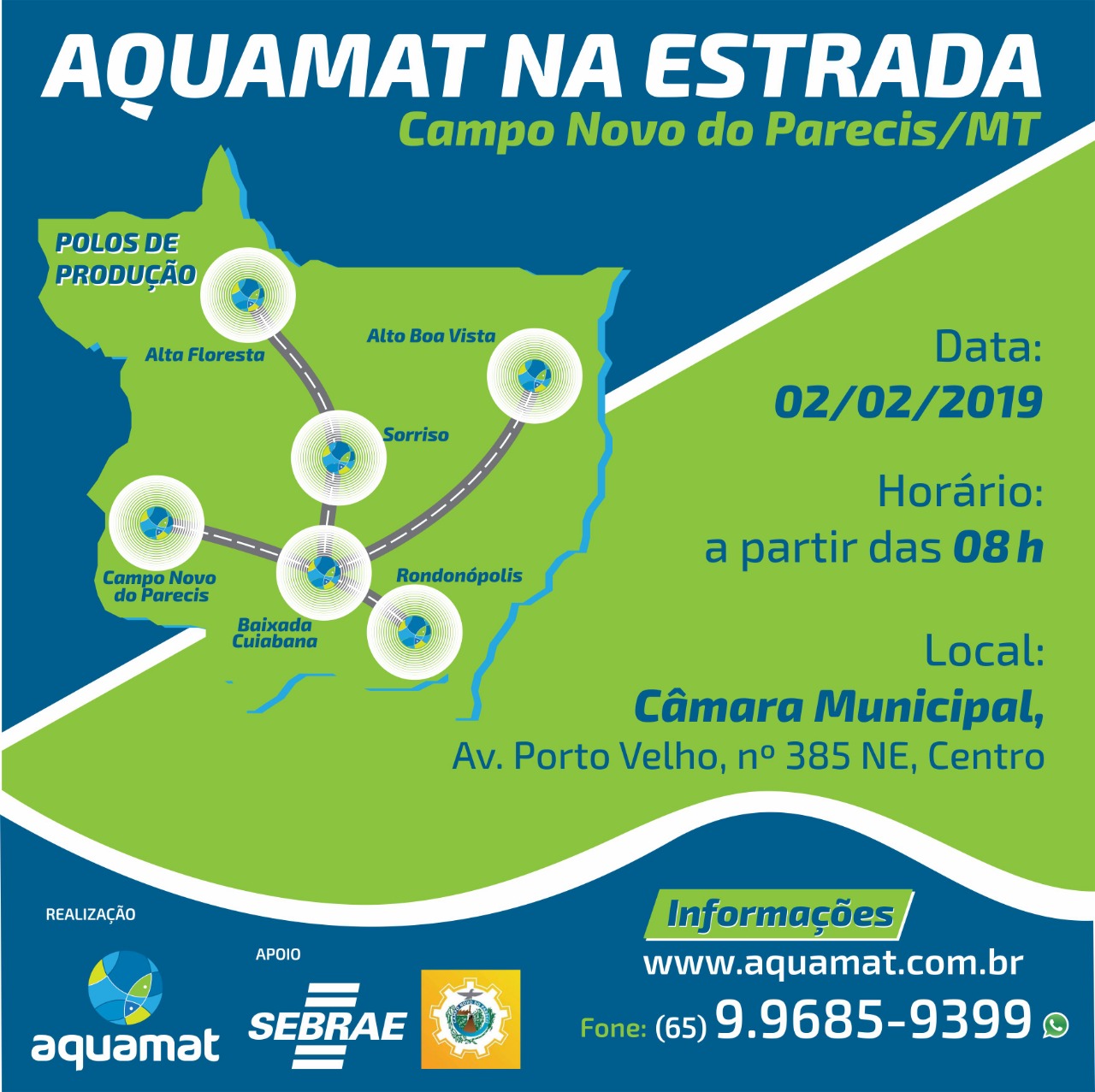Em Campo Novo dos Parecis, o Aquamat Na Estrada acontece na Câmara Municipal, na Rua Porto Velho, número 385 NE, Centro, a partir das 8 horas da manhã. Outras informações no site: www.aquamat.com.br ou (65) 99685-9399.