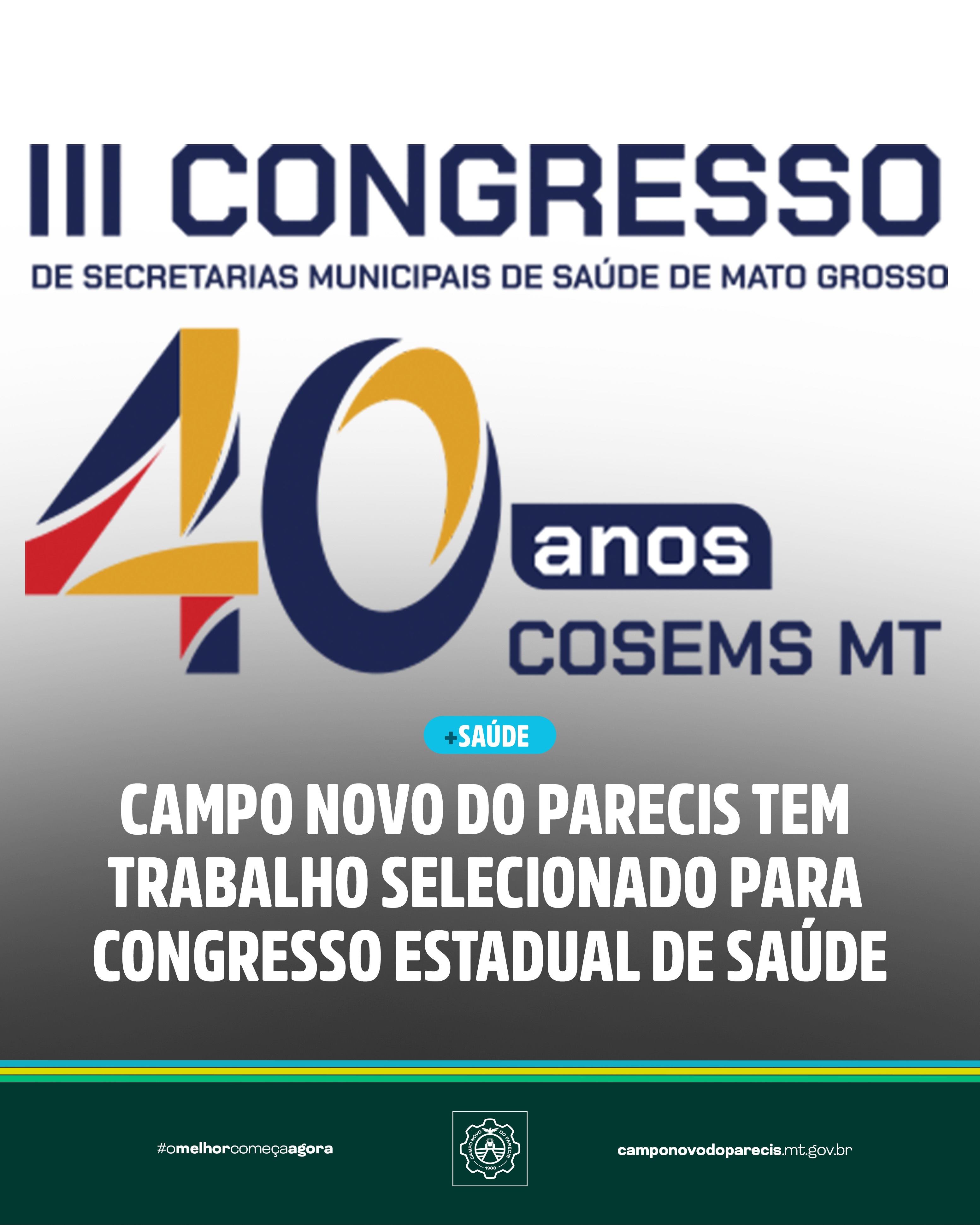 O município de Campo Novo do Parecis foi destaque ao ter um trabalho selecionado para apresentação no 3º Congresso de Secretarias Municipais de Saúde de Mato Grosso (Cosems), que será realizado nos dias 13, 14 e 15 de maio de 2026.