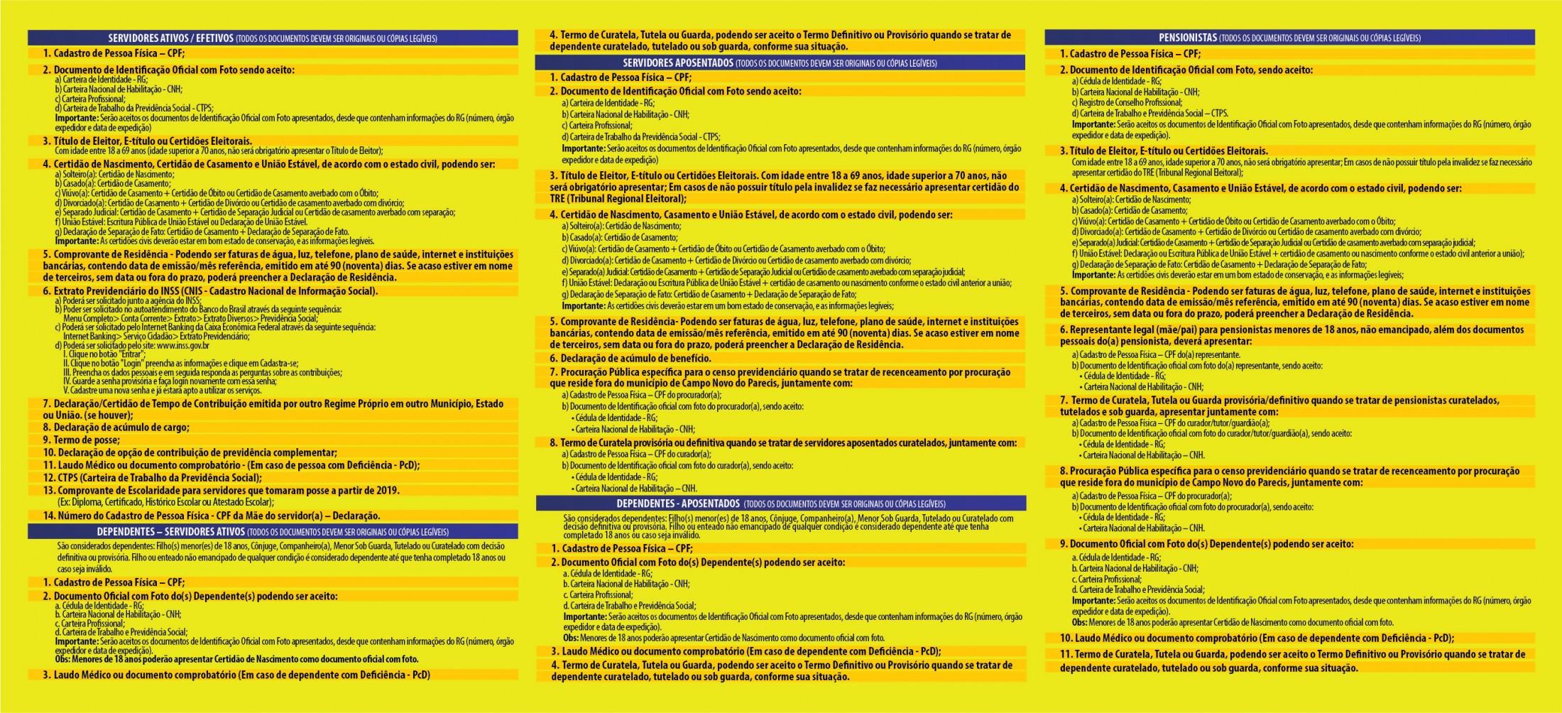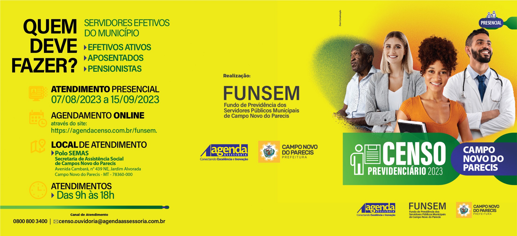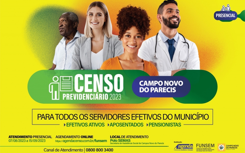 O Fundo de Previdência dos Servidores Públicos Municipais de Campo Novo do Parecis (FUNSEM) divulga o Censo Previdenciário 2023, que terá atendimento presencial do dia 07/08/2023 à 15/09/2023. O local de atendimento será a secretária de Assistência Social, localizada na Rua Cambará 439 NE, Alvorada.