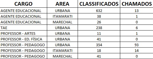 De acordo com os dados atualizados, o cargo de Agente Educacional na área urbana conta com 632 classificados, sendo 13 já convocados. Na região de Itamarati, são 38 classificados e 1 chamado, enquanto em Marechal há 26 classificados, ainda sem convocações.