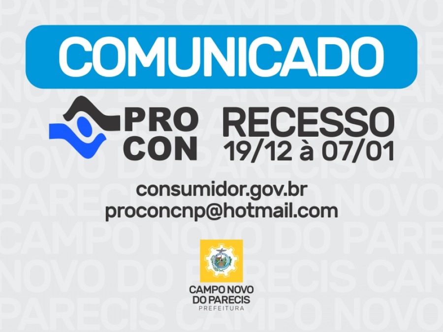 Entre os dias, 19 de dezembro a 07 de janeiro, os consumidores deverão fazer suas reclamações via internet, no endereço eletrônico: consumidor.gov.br ou pelo endereço proconcnp@hotmail.com.