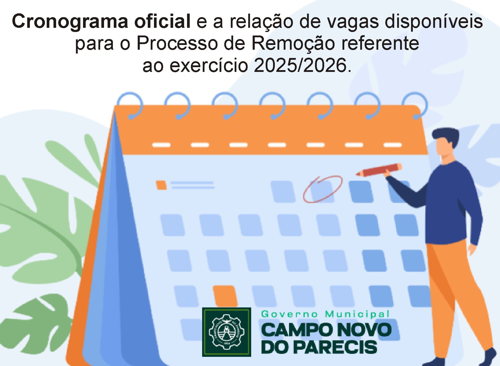 O Governo Municipal através da Secretaria Municipal de Educação - SME, em conformidade com o Decreto Municipal nº 237, de 07 de novembro de 2025, que "DISPÕE SOBRE A DEFINIÇÃO DE CRITÉRIOS PARA O PROCESSO DE REMOÇÃO DE PROFESSOR E DE AGENTE EDUCACIONAL INFANTIL, EFETIVOS E ESTÁVEIS NA REDE PÚBLICA MUNICIPAL DE ENSINO DE CAMPO NOVO DO PARECIS - MT", vem por meio deste comunicar e divulgar o Cronograma oficial e a relação de vagas disponíveis para o Processo de Remoção referente ao exercício 2025/2026.