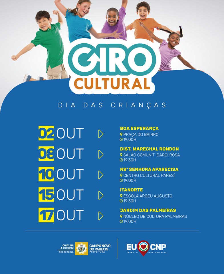 É conveniente recordarmos de que o mês de outubro traz uma data especial, o dia das crianças está chegando, e por meio da Secretaria de Cultura e Turismo de Campo Novo do Parecis estarão realizando giros culturais.