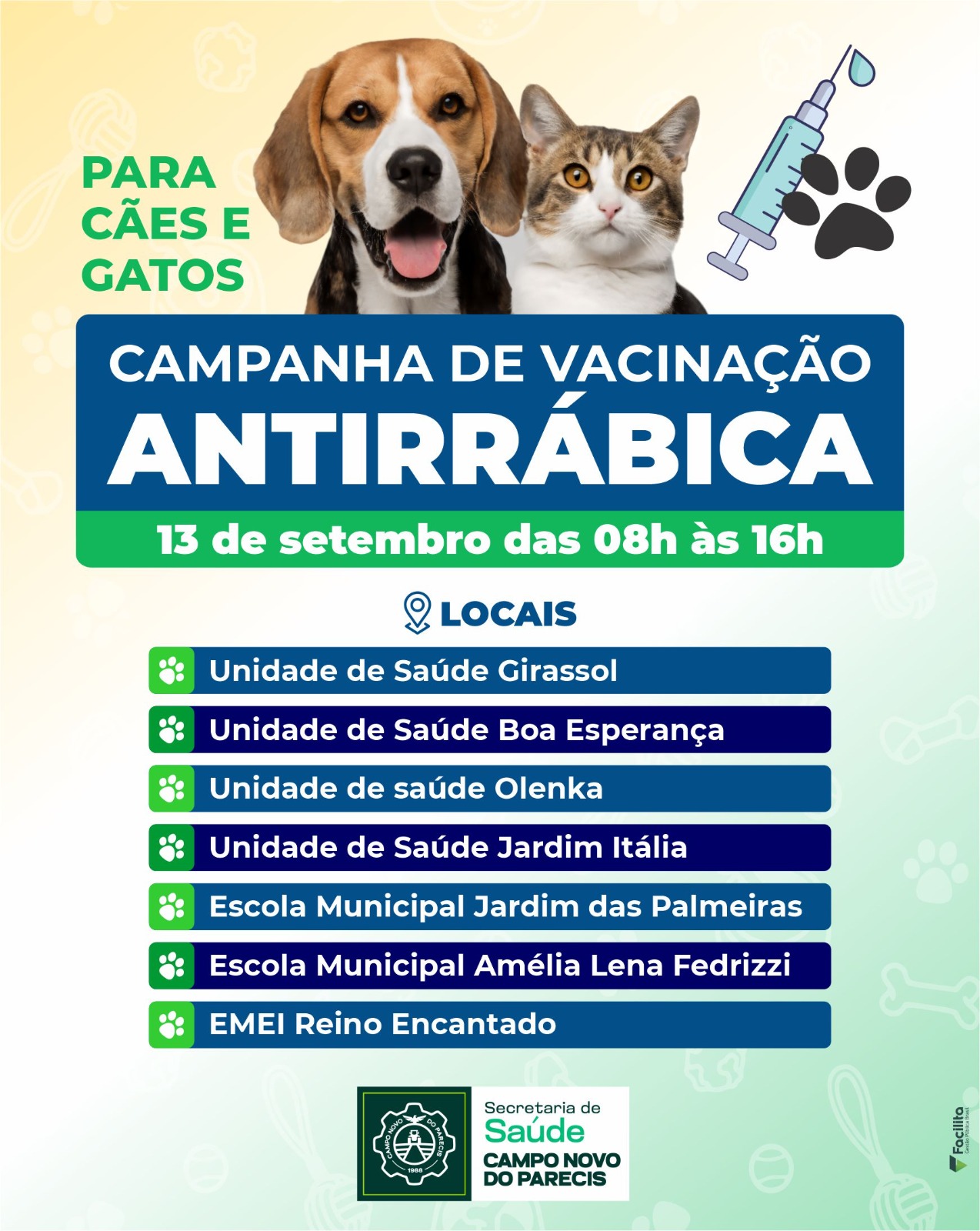 O Governo Municipal, por meio da Secretaria Municipal de Saúde, realiza no próximo dia 13 de setembro, das 08h às 16h, o Dia D da Campanha de Vacinação Antirrábica. A ação tem como objetivo proteger cães e gatos contra a raiva, uma doença grave que pode ser transmitida aos seres humanos.