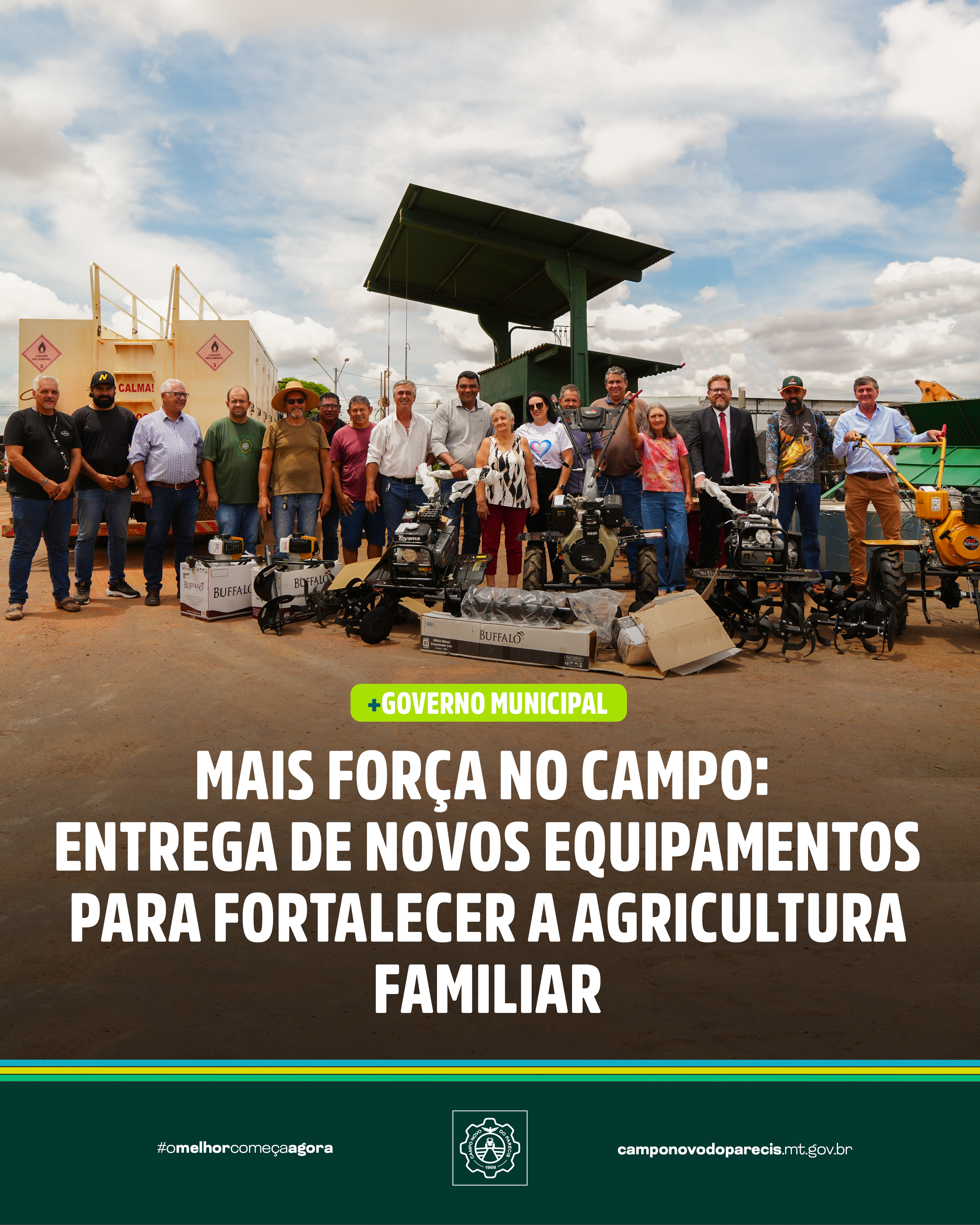 A Prefeitura de Campo Novo do Parecis, por meio da Secretaria Municipal de Desenvolvimento Econômico e da Coordenação da Agricultura Familiar, recebeu hoje novos equipamentos e maquinários destinados ao fortalecimento da agricultura familiar.