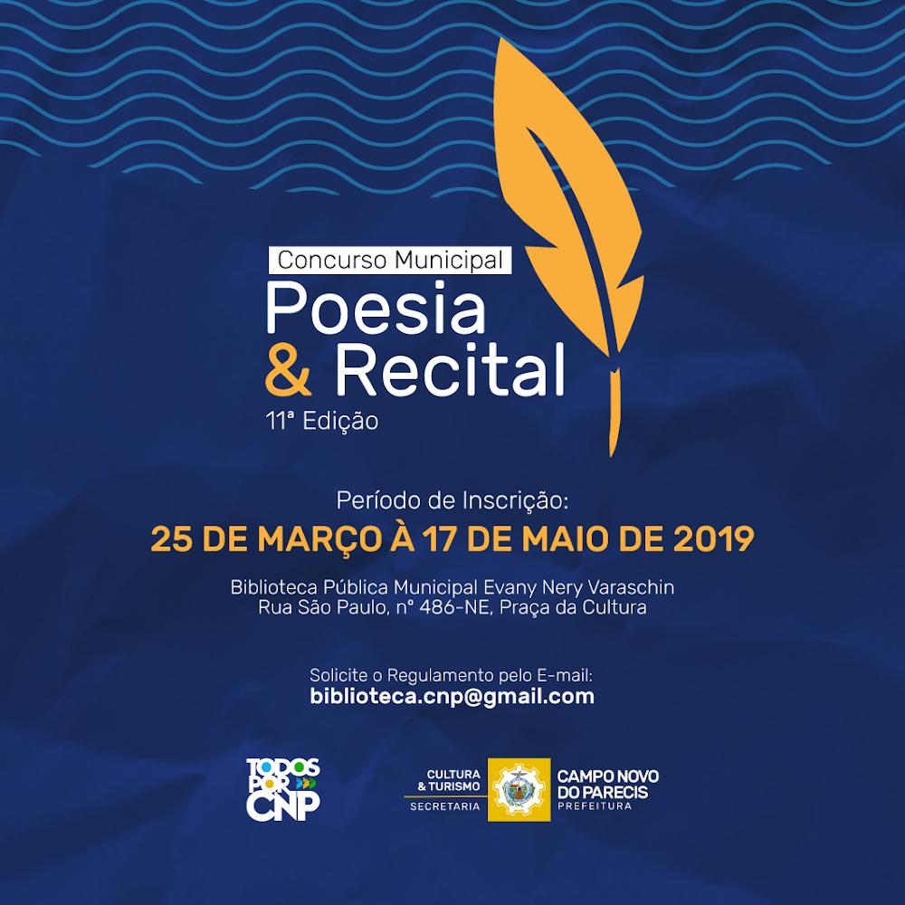 Podem participar do Concurso Municipal de Poesias todos os estudantes e comunidade em geral de Campo Novo do Parecis que se inscreverem, até o dia 17 de maio de 2019, sendo admitidos somente trabalhos inéditos e não publicados. A inscrição é gratuita!