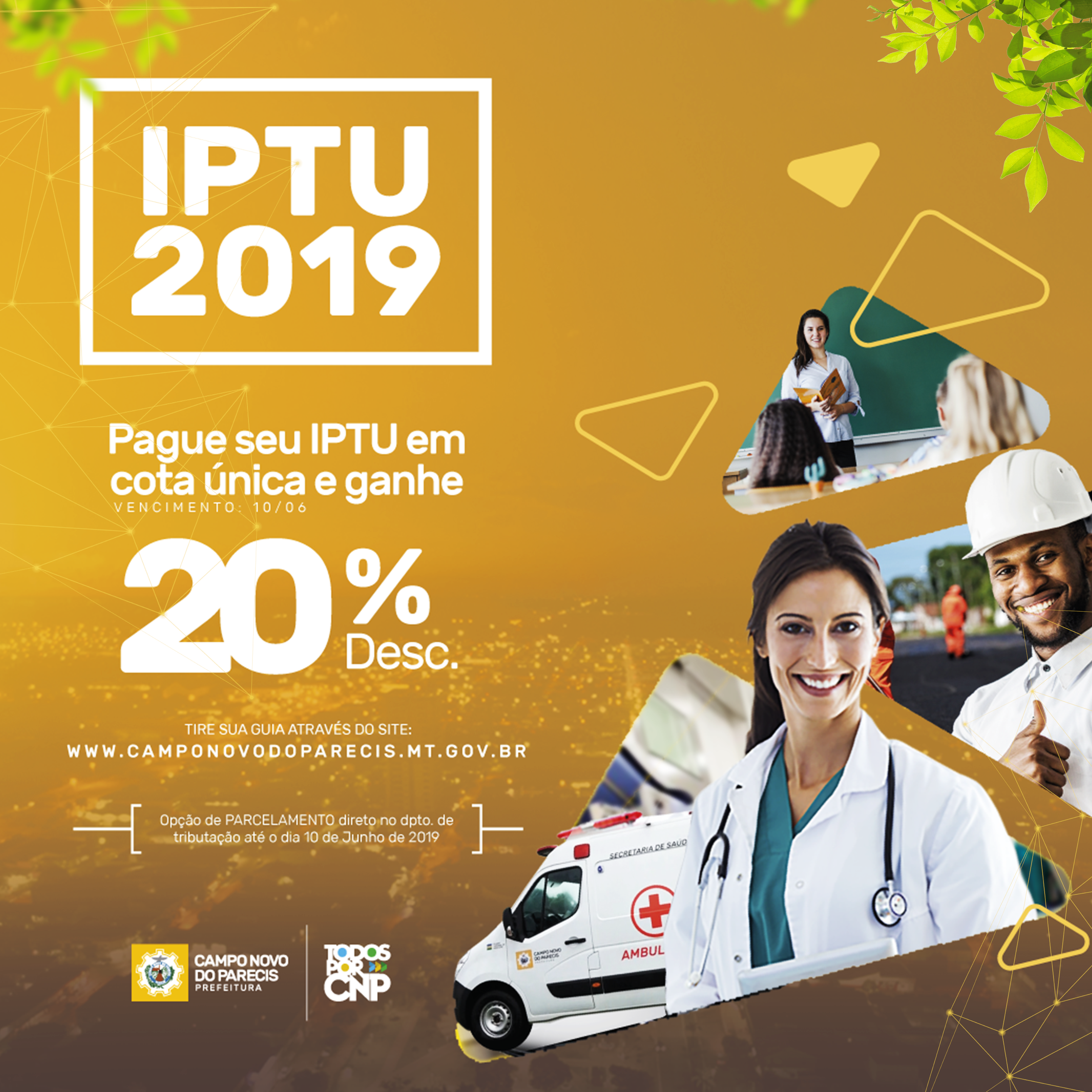 Os contribuintes deverão retirar o carnê do IPTU-CIP/2019 no endereço eletrônico www.camponovodoparecis.mt.gov.br ou no Núcleo da Secretaria Municipal de Finanças, quais sejam, Departamento de Cadastro e Tributação, localizado na Rua São Luiz, nº. 812-NE, Centro, nesta cidade, antes da data do vencimento da cota única para obtenção dos descontos previstos na legislação pertinente.