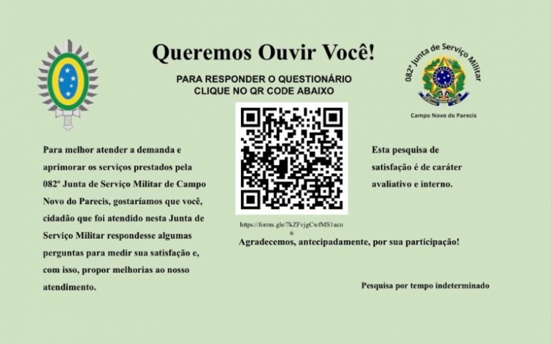 A Junta de Serviço Militar de Campo Novo do Parecis tem o prazer de anunciar a pesquisa de satisfação que estará disponível nos próximos dias. Essa iniciativa irá aprimorar ainda mais os serviços prestados e garantir uma experiência satisfatória para todos os cidadãos que utilizam esses recursos.