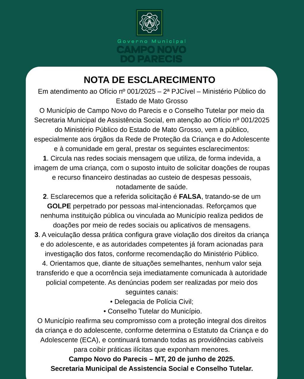 O Município de Campo Novo do Parecis, por meio da Secretaria Municipal de Assistência Social e o Conselho Tutelar em atenção ao Ofício nº 001/2025 do Ministério Público do Estado de Mato Grosso, vem a público, especialmente aos órgãos da Rede de Proteção da Criança e do Adolescente e à comunidade em geral, prestar os seguintes esclarecimentos: