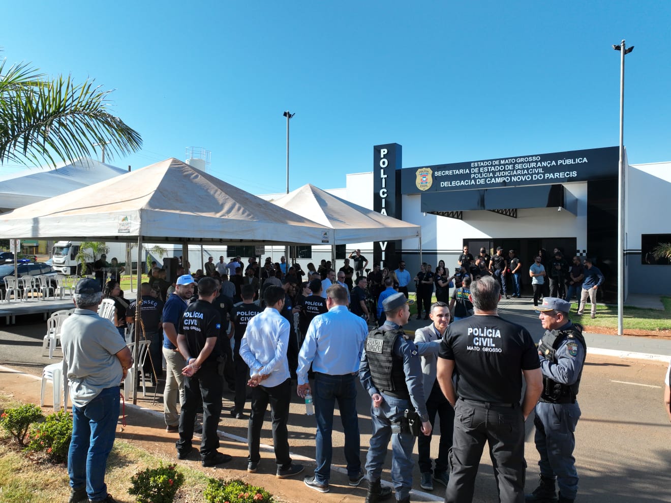 A Polícia Judiciária Civil do Estado de Mato Grosso inaugurou na manhã desta sexta-feira (5) o novo prédio da Delegacia de Campo Novo do Parecis. A solenidade contou com a presença de diversas autoridades, entre elas o Prefeito de Campo Novo do Parecis, Rafael Machado, o deputado estadual Sebastião Rezende, o delegado geral adjunto da Polícia Civil, Rodrigo Bastos da Silva, o presidente da OAB local, Dr. André Castro, além de Juízes e Promotores do estado.