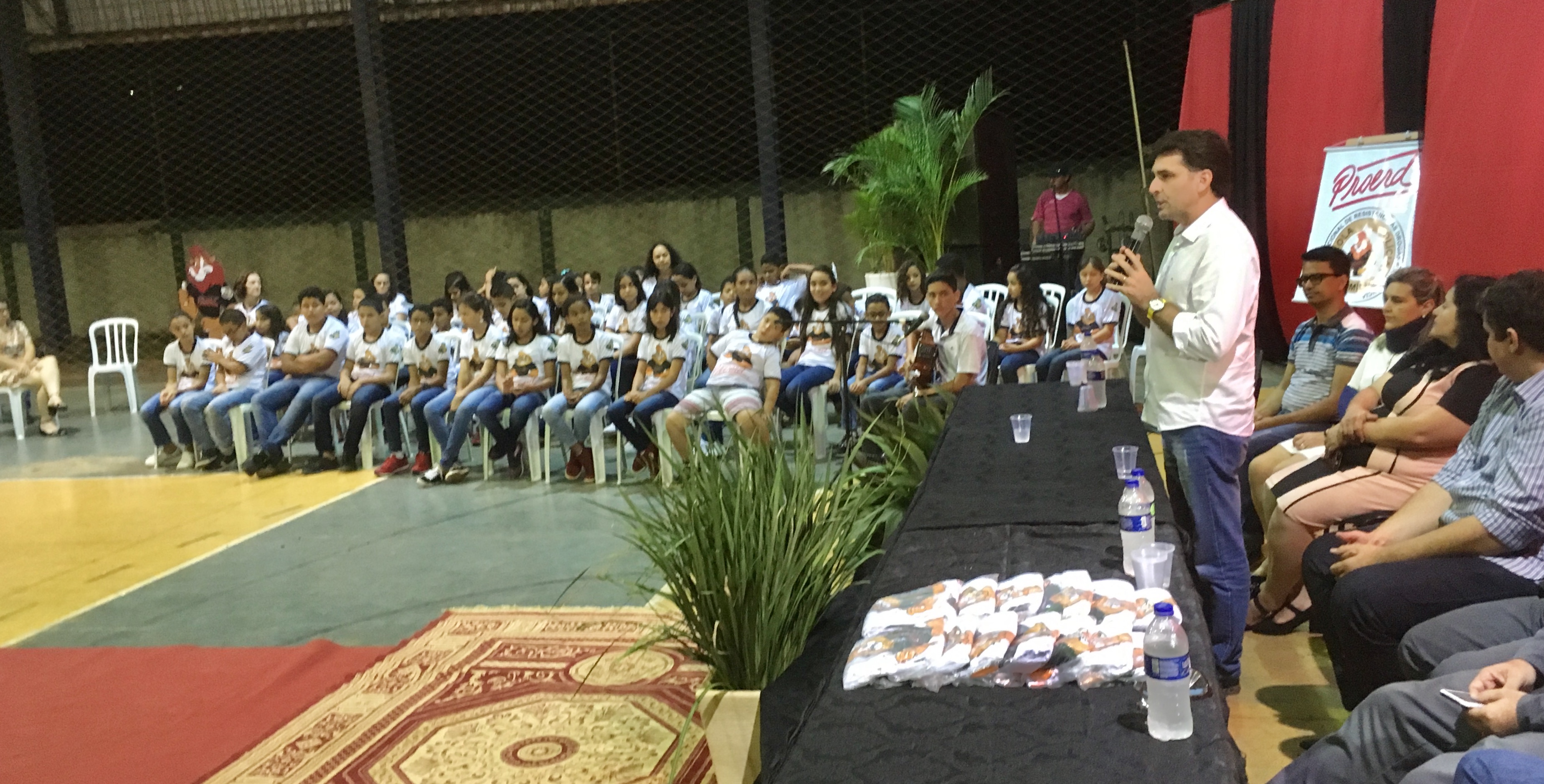 O evento foi realizado na quadra poliesportiva da escola e contou com a presença das autoridades e pais dos alunos. O projeto foi realizado na escola através da parceria da Polícia Militar e Governo Municipal.