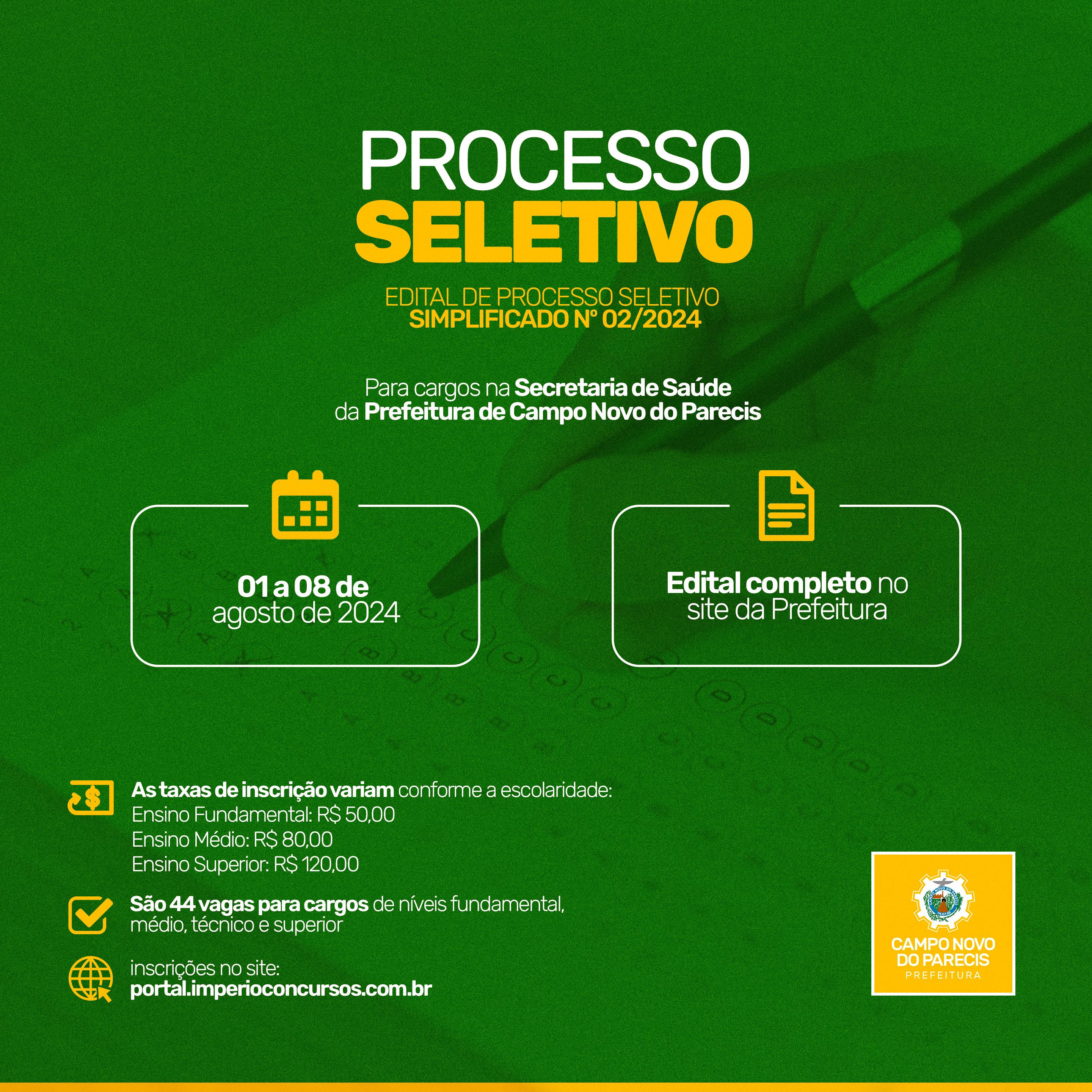 A Prefeitura Municipal de Campo Novo do Parecis abre no próximo dia 1º de agosto inscrições para o Processo Seletivo Simplificado para contratação e formação de cadastro reserva de servidores para atender a natureza emergencial. São 44 vagas para cargos de níveis fundamental, médio, técnico e superior, com remunerações de até R$ 25.877,68.