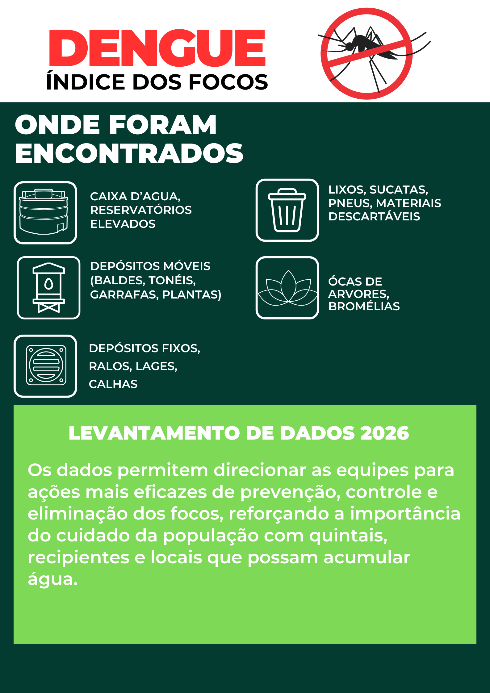 Os resultados apontam que a maioria dos focos está relacionada a recipientes descartáveis e materiais deixados em quintais, reforçando que a eliminação de criadouros depende, principalmente, da colaboração da população. A Vigilância Sanitária e a equipe de Endemias seguem realizando visitas domiciliares, orientações, notificações e ações de borrifação nos bairros com maior incidência.