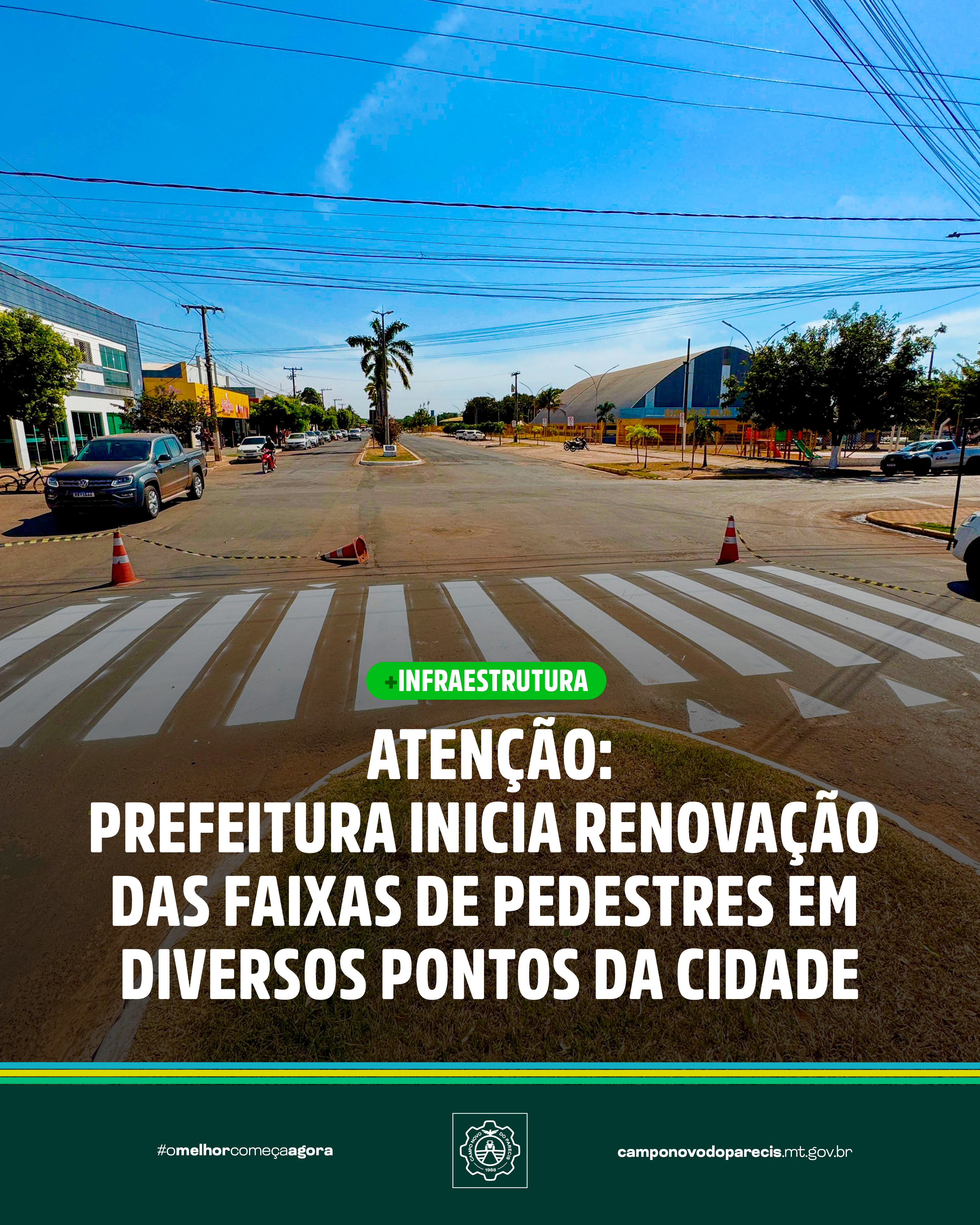 O Governo Municipal de Campo Novo do Parecis deu início ao trabalho de renovação das faixas de pedestres em diversas vias do município. A ação faz parte do cronograma de melhorias da infraestrutura e visa garantir mais segurança para motoristas e, principalmente, para os pedestres.