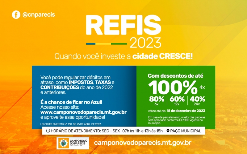 O Programa de Recuperação Fiscal (REFIS) é uma ferramenta eficaz amplamente utilizada por municípios e governos para permitir que empresas e indivíduos regularizem suas dívidas tributárias. Em Campo Novo do Parecis, a oportunidade de aderir ao REFIS foi estendida até o dia 15 de dezembro de 2023, proporcionando uma janela adicional para contribuintes que buscam regularizar suas pendências financeiras com descontos e condições facilitadas.