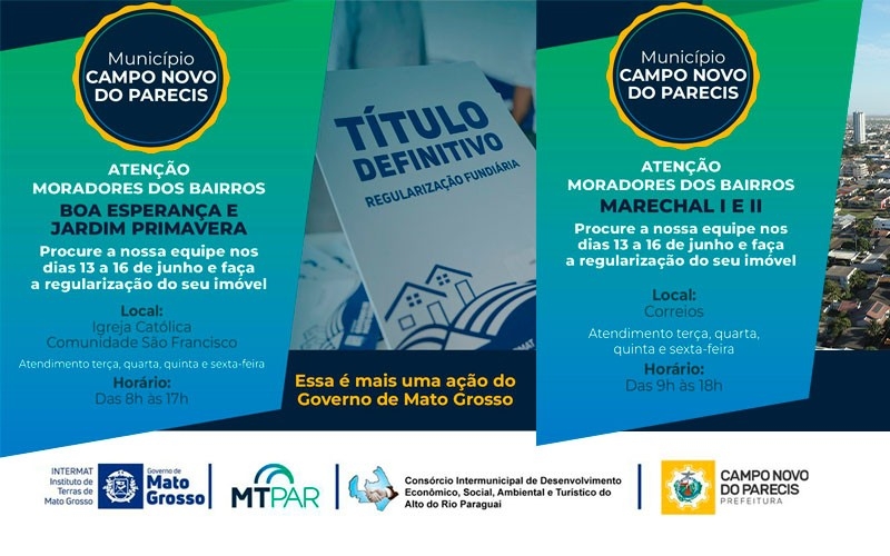 A Prefeitura Municipal de Campo Novo do Parecis, através da Secretaria de Desenvolvimento Econômico e Meio Ambiente realizará atendimentos para regularização de imóveis nos bairros, Boa Esperança e Jardim Primavera e distrito Marechal Rondon (bairros Marechal I e Marechal II).
