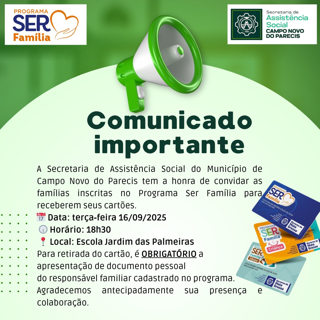 A Prefeitura de Campo Novo do Parecis, por meio da Secretaria de Assistência Social, informa que as famílias inscritas no Programa Ser Família estão convocadas para receberem seus cartões.
