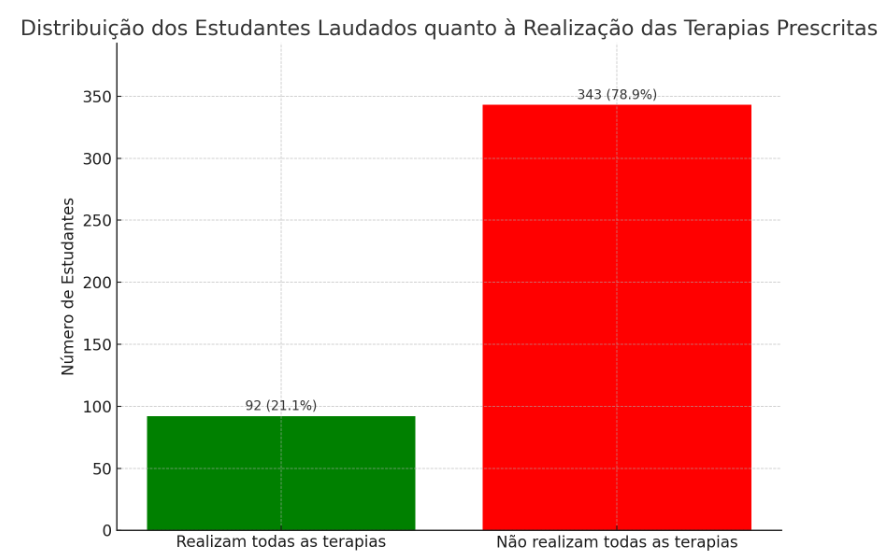 Os dados evidenciam que a maioria dos estudantes com laudo ainda não tem acesso integral às terapias prescritas, seja em razão da insuficiência na oferta dos serviços, limitações estruturais ou outros fatores impeditivos. Tal cenário reforça a urgência de ampliação do suporte terapêutico, bem como da implementação de estratégias intersetoriais que assegurem o acompanhamento contínuo e adequado às necessidades específicas de cada estudante, conforme preconizado pelas normativas da Política Nacional de Educação Especial na Perspectiva da Educação Inclusiva e da Lei Brasileira de Inclusão da Pessoa com Deficiência (Lei nº 13.146/2015).